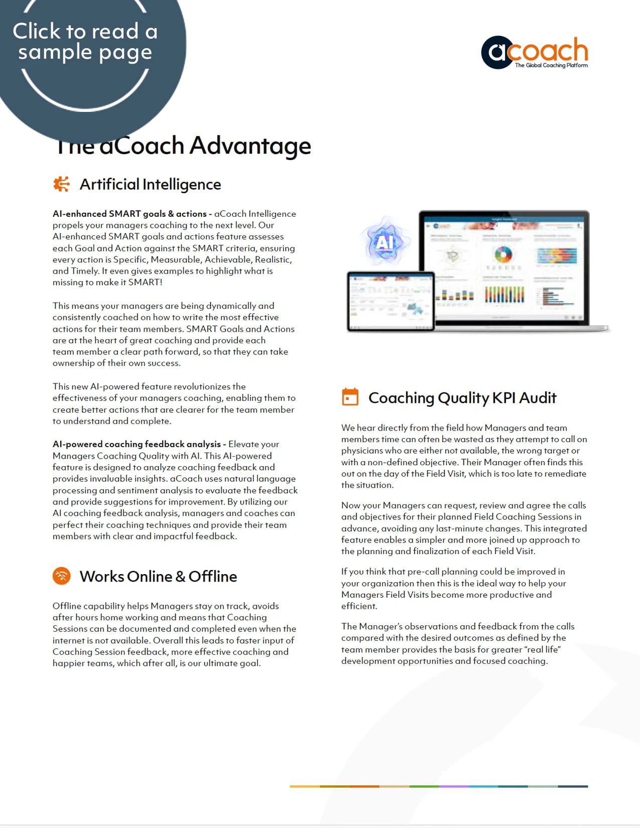 This brochure gives an effective and detailed explanation of the various features and functions of the aCoach sales coaching platform. It shows the ways in which aCoach can benefit and optimize your staff coaching system and takes you through the key implementation steps for you to make the most of aCoach in your business.